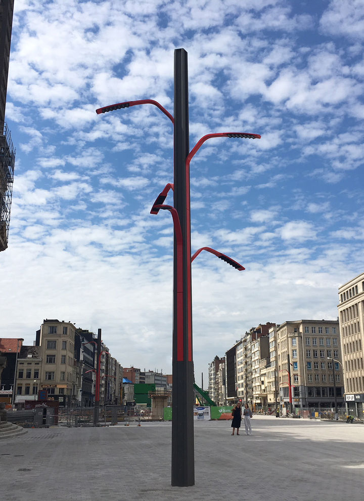 Op het Operaplein in Antwerpen zijn imposante geprofileerde stalen masten geplaatst, ontworpen voor de bevestiging van armen met geïntegreerde armaturen. Oorspronkelijk bedacht in beton door de architect, werd dit concept door ons vertaald naar een innovatieve stalen uitvoering. Dit zorgt niet alleen voor een lichtere en flexibelere constructie, maar behoudt ook de robuuste, architecturale uitstraling die perfect past binnen de stedelijke context van het plein.